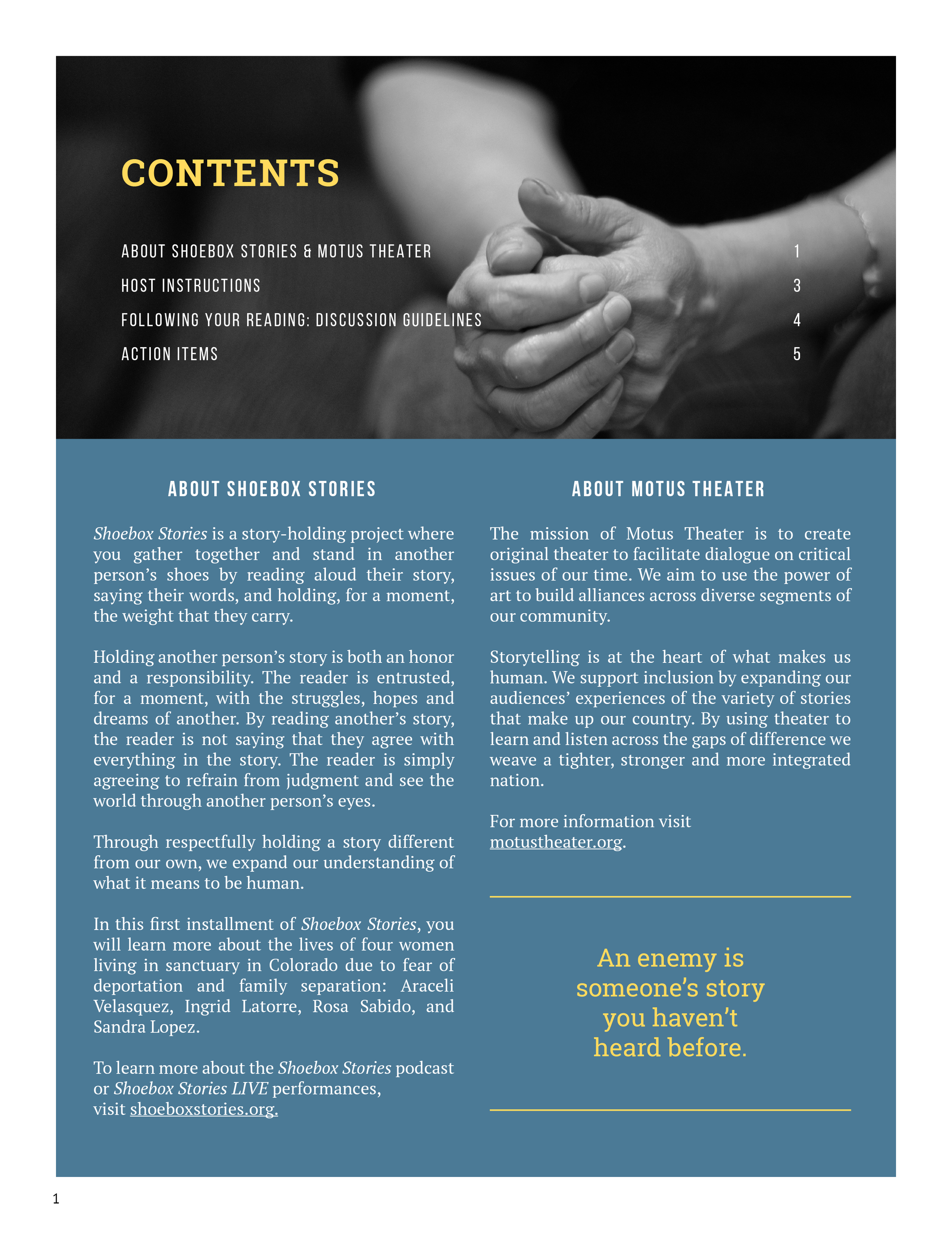 Our work supports the mission of Motus Theater- to create original theater to facilitate dialogue on critical issues of our time.